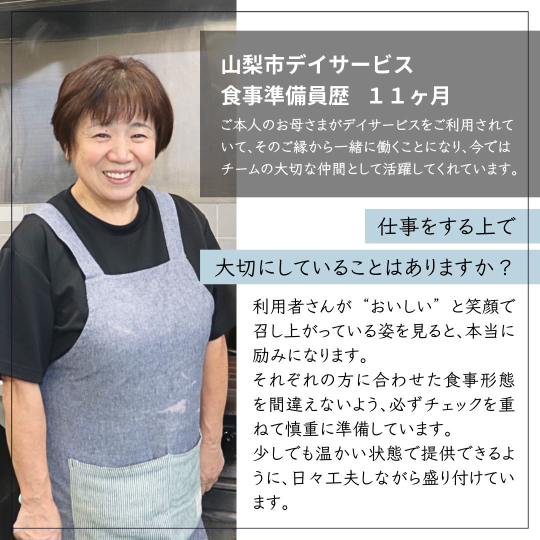 お子様の学校行事や急な体調不良、あるいは趣味や副業といった「自分自身の時間」を大切にしながら、無理なく介護の仕事に携われる職場です。